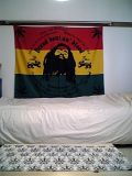 | 今週は、沖縄県出身のT屋さんの部屋です。  さすが故郷を愛しているだけに、南国ムードあふれるお部屋です。 結構きれいに片付いてますね〜。 「おしゃれなカーテンですね。」 「カーテンを自分で作ったんですけど開かないんですよ。なので日が入りません(^^;)」 |  「一番のお気に入りポイントは何ですか?」 「この仙台で一目ぼれしたタペストリーです!!」  「おおっと!これはっ!!」 「ウチナンチュ〜(沖縄人)なら三味線を弾けなきゃダメだと思って練習しています。結構弾けるようになりました。」 |