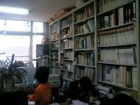 これが川本研究室です。研究に関する本や資料が立ち並び、 環境はとても良好です。 植物も沢山あるので、常に新鮮な空気の中研究や仕事に打ち込めます。 |