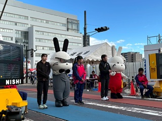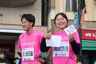 | 11月3日(月)に、JR福島駅前通りにて第19回ももりんダッシュNO.1が開催されました。老若男女問わず幅広い世代の方々が30mを駆け抜け、福島駅前は大いに盛り上がりました!!今年も実行委員長の片平先生をはじめ、市商店街連合会やチーム川本の方々、数多くの企業、OB・OGの皆様のおかげで無事に第19回ももりんダッシュNO.1を大成功に納めました。それでは早速、学生に話を聞いていきましょう! | |