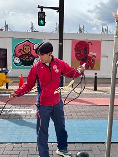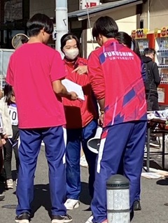 | 次に、3年の赤坂に話を聞いてみました! 交通整備を行ってみてどうでしたか? 赤坂「私は交通整理の担当として参加しました。大会当日は朝早くから会場に集まり、コース周辺で車や歩行者の誘導、安全確認を行いました。無事安全に終えることが出来て良かったと安心しています!」無事に終えることが出来てまずは良かったですね! 「小さな子どもから大人の方まで、幅広い年齢のランナーが笑顔で走っている姿を見ることができ、とても印象的でした。交通整理中には通行される方から『これ、何歳でも出られるの? すごいね!』と声をかけていただくこともあり、地域の方々の温かさを感じました。走る人たちが安心して全力を出せるように、そしてイベント全体が安全に進行するように意識して行動しました。運営を行う側として大会を支えられたことに達成感があり、支えて下さる皆さんに感謝だなと改めて感じることの出来たイベントとなりました!」 大成功のイベントとなりましたね! ありがとうございました! |