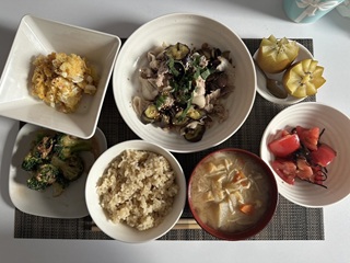 郷右近「今週は私のご飯です。今年は夏の暑さが特に厳しく、食欲が落ちがちになる季節だと思います。そこで、今回はさっぱりと食べられる夏バテ解消レシピをご紹介させて頂きます。メインは豚しゃぶナスです。味付けはポン酢でさっぱりと、大葉や胡麻をトッピングすることで、風味は保ち食欲をそそるようにしています。また、トマトやブロッコリーなど手軽に食べられ調理が簡単なもので、あまり手間をかけずに食事の用意をすることで、忙しくても栄養を摂ることができます。また汁物には具をたくさん入れることで栄養と満足感を得られるようにしています。写真の左上はポテトサラダですが、かぼちゃサラダにしてナッツをトッピングするのも満足感があり、おすすめです。またじゃがいもにはビタミンCも入っているので、風邪などの体調不良を予防することにも役立ちます。キウイは私が個人的に好きなフルーツでよく食べる、という感じです。夏の厳しい暑さを乗り越えられるよう食事も大切にしていきたいです」 とても美味しそうです!! 栄養をしっかり考えた食事を心がけているのですね! |
