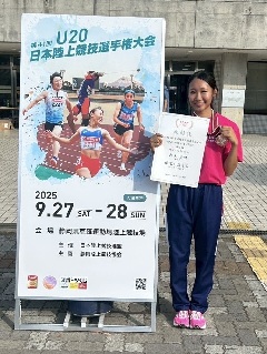 | 1年の松木に話を聞きました! U20日本選手権お疲れ様でした! 松木「今回、U20日本選手権に400mHで出場させていただき、60秒17で3位でした。去年からこの大会で最低3位になるという目標を掲げて1年間頑張ってきたので、その目標を達成することができて本当に嬉しいです。今までは全国大会ベスト順位が6位だったので、それを更新できたこと、ずっと欲しかったメダルも取ることができ嬉しいです。なんとしてでも決勝に残りたいと思っていました。前日、寝付くのに1時間以上かかるくらいプレッシャーを感じていましたが、予選を1着で通過した時とっても心が楽になりました。決勝のアップで『これいけるかも』という自信がなぜかあったので、レースを楽しみながら自分に期待して決勝に臨みました。決勝では、作戦通り落ち着いて前半入れたので、後半勝負する走りができ、やるべき事をやって競り勝てたことが自信に繋がりました」楽しんで走ることができたレースだったのですね! 「高校の時に仲良くなった全国のお友達とも再会できて、たくさんお話出来たので楽しかったですし、刺激を貰えたので、次会えるまで頑張りたいです。また、素敵なニュースをみんなに届けるという目標も達成できたかなと思います!!今回もたくさんの方に支えられ、応援されて出られた大会だったので、これからもレベルアップした自分を見せられるように努力したいです!!」 更に上を目指して、引き続き頑張っていきましょう! ありがとうございました! |