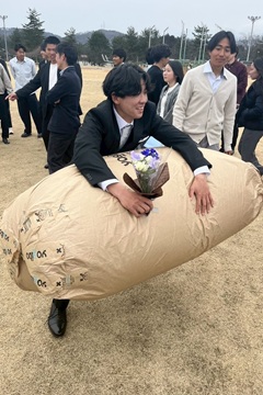次に、今に話を聞きました! 卒部式はいかがでしたか? 今「ご卒業ありがとうございました。卒業生からのお話では、名前順だと思っていましたが、席順になり少し困惑しつつも適応しました。4年間培ってきた適応力を発揮できたことを嬉しく思います。出番まで話す内容を考えていましたが、どんなに考えてもSKBMが頭をよぎりました。よって、SKBMをメインとした内容構成になりましたことを謝罪申し上げます。そして、皆さんも感じたとは思いますが、SKBMのお言葉は重みも深みも色みも違いました。言葉を区切る度に表情、立ち振る舞い、髪型、毛の濃さを変化させ、視聴者を飽きさせない表現に私は鼻が詰まりました。そして私と廣嶋君のプレゼントは、全てがSKBM関連だったので、ブランド化したのかと勘違いしました。しかし、彼の笑顔はどんなブランドよりも輝いていたので、勘違いではありませんでした。そんな中で、院生の湯田周平選手からブラックニッカ700mlをいただいた時は感謝しきれませんでした。全てが嬉しかったです。卒業生の為に沢山の準備をして下さりありがとございました」 |