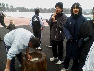 | 今年も恒例のTCとのもちつき大会が、福島大学のグラウンドにて行われました。つきたてのお餅を、部員一同ありがたく頂きました。2月の寒空の中いただいたお餅は、とても温かくおいしかったです。TCの皆様、ありがとうございました。 学生のコメントは以下の通りです。 |