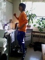 健康グッズにはこんなものもありました。通販でよく見かけるエクササイズマシンですね。 OGの吉田さんに乗っていただきました。 これを使って毎日シェイプアップしているのでしょうか? (してる訳ないでしょ。:吉田談) |
