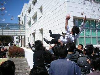 | 3月24日(金)、福島大学の卒業式が行われました。今年は風は強かったものの好天に恵まれ、気持ちのいい卒業式となりました。4年生への感謝の気持ちをこめて、式の後には在学生が卒業生一人ひとりにエールを送り、恒例の胴上げや写真撮影で盛り上がりました。賑やかに行われたエールは、他の部活の人たちや保護者の方の注目も集めました。 | |