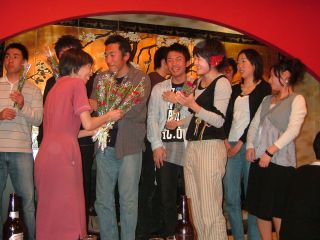 宴会の最後に4年生は珍満の某女将さんから花束を受け取り、4年間お世話になったお店にも最後の別れを告げました。もしまた機会があればいらして下さいね。 |