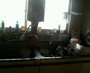 それでは最後にキッチンを紹介します。 共同キッチンらしいのですがさすが男の巣、混沌としてますね・・・。 「いや、ほとんどの人が清潔に使おうとしてるのですがただ一人きれいに使わない人がいるんですよ。」 そうですか、共同生活で調和を乱す人は最低ですね。皆さんも共同作業にはきをつけましょう。 他にも風呂、トイレが共同らしいです。 以上、名ばっかりの今週の部屋スペシャルでした〜♪ |