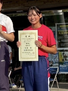 次に、4年の福嶋に話を聞きました! 今大会の結果を教えてください! 福嶋「100mHと100mに出場し、100mHでは優勝、100mでは予選で自己ベストを更新し、2位でした。100mHでは、自己ベスト更新を目標としていたのであと少し届かず悔しい結果となりましたが、2年振りに優勝でき、チームに8点を持ち帰ってくることができてとても嬉しいです。試合内容としては、予選から決勝でタイムを上げることができた点は良かったと思います。しかし、決勝で勝ちたい欲がすごく出てしまい走りが崩れてしまいました。焦らず自分の走りができていればもっとタイムを出すことができたと思います。 100mでは、優勝と11秒台を目標としていました。自己ベストは更新できたものの目標を達成することができませんでしたが、11秒台は遠くないと感じたので、引退までに11秒台を出したいと思います」 優勝おめでとうございます! 「また、大会MVPに選んでいただきました。人生初のMVPでとても嬉しいです。 100mHと4×400mRの2冠したことで選んでいただきましたが、4冠ができる位置にいたのでその点はとても悔しいです。沢山の応援を受けて、自信を持って笑顔でスタートラインに立てたからこその結果です。本当に応援が力になりました。ありがとうございました!このチームで戦う最後の対校戦でしたが、4年生の意地を少しだけ見せられた大会だったのではないかと思います。引退まであと2試合になりますが、自己ベスト更新を目指して最後まで駆け抜けます!」 MVPおめでとうございます! ありがとうございました! |