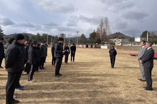 ![]() 部旗を受け取り、感謝を申し上げる 主将の鈴木(部旗を持っているのが鈴木) |