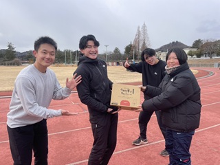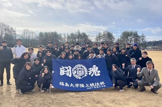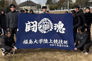 | 二月に入り、冬の寒さもピークを迎えました。気温は低いものの、陸上競技場に雪が積もることは少なく、恵まれた環境で練習をすることができています。そんな中で福島大学陸上競技部が対校戦で使用している部旗をOB会の方々に新調していただき、2月1日(日)にOB会会長の根本会長より贈呈していただきました。その贈呈式の写真をご覧ください! | |