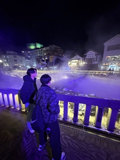 | 次に、群馬県出身の萩原に話を聞きました! 出身地について教えてください! 萩原「関東出身の僕が紹介するのは草津温泉です。草津温泉は群馬にある有名な温泉です。みなさん一度は聞いたことがあるのではないでしょうか。年末年始に帰省した時に友達と3人で行きました。なんといっても湯畑がすごく綺麗です。特に夜にライトアップされた湯畑はすごく綺麗でずっと見ていられます」ライトアップされた湯畑とても気になりますね! 他にどんな魅力がありますか? 「食べ歩きも楽しいです。食べ歩きをしていると饅頭おじさんに出くわすでしょう。このおじさんは毎日饅頭を道ゆく人に無料で配っています。すごく美味しいです。暖かいお茶ももらえます。また、いろんなところに温泉があるのでたくさん入ってみると良いと思います。足湯もあるので寒い時に入るとずっと入っていたくなります。もし気になる人がいたらYouTubeで草津温泉ライブカメラを観てみてください。これを観るだけで行きたくなること間違いなしです!」 この季節にはもってこいの場所ですね!ぜひ行ってみたいです! ありがとうございました! |