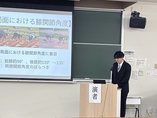 次に、「100m走における視線の置き方がスタート動作に与える影響」というテーマで発表した、郷右近に話を聞きました! 卒業論文発表会を振り返って、いかがですか? 郷右近「2月13日に卒業論文発表会がありました。今日卒業論文発表会に至るまで様々なことがありました。実験計画がうまくいかない、実験のやり直しなど色々と壁にぶつかりながら卒業論文を進めました。実験のやり直しがあったため、ゼミ生をはじめ、4名の陸上競技部の同級生、後輩の実験に快く協力してくれたみんなには感謝してもしきれません。いろんなことがありましたが、何とか卒業論文発表会を迎えることができました。発表時には後輩たちがきてくれてとても嬉しかったです。視線の置き方がスタート動作に与える影響として発表させて頂きました。女子選手を対象に行い、女子選手は男子選手よりもスタート時の前傾姿勢が浅い傾向にあるため、私の発表したことがスタート動作の前傾姿勢の作り方を改めて考えるきっかけとなってくれたら嬉しいです」とても興味深いテーマでした! どのようにテーマを決定したのですか? 「このテーマを決める上で吉田監督からの指導がとても大きく関わっています。私はスタート後すぐに上体が起き上がってしまう課題がありました。その時に監督がスタートの時に、足元を見て走るようアドバイスして頂いたことから、卒業論文のテーマの決定に至りました。吉田監督ありがとうございました。陸上競技部を引退してから、卒業論文に追われていましたが、無事卒業論文発表会を迎えられたこと感謝しています。ありがとうございました」 感謝の気持ちを忘れずに、これからも頑張っていきましょう! ありがとうございました! |