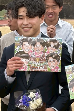 次に、郷右近に話を聞きました! 福島大学陸上競技部として最後の活動でしたがどうでしたか? 郷右近「まず初めに素敵な卒部式を開いてくださり本当にありがとうございました。また吉田監督、蓮沼先生、お忙しいところ卒部式では、私たちにお言葉や応援メッセージを伝えて下さいました。ありがとうございました。卒部式では、4年生一人一人からの言葉があり、みんなの話を聴いていくうちに、4年間の思い出がたくさん思い出され、凄く濃い4年間だったと感じました。また、後輩の皆さんから記念品のトレーナーを頂いたり、色紙を頂いたり、すごく嬉しかったです。色紙に書いてくれたみんなからのメッセージに感動し、社会人になってからも見返して勇気をもらいたいなと思います」 |