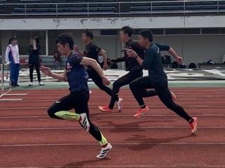 最後に、2年の高橋に話を聞いてみました! 今大会の結果を教えてください! 高橋「今回、私は男子100mに出場させていただき、結果は11秒34でした。その日のコンディションや初試合という状況を踏まえ、数字だけ見れば決して悪いタイムではありませんでした。しかし、普段の練習で積み上げてきた走りを本番で出し切れなかったことに、正直なところ悔しさが残りました。特に、スタート直後の視線の上げ方、中盤でのギアの切り替え、そして腰をしっかり乗せて走る意識といった技術面が、まだ自分の中で固まりきっていないと痛感しました。練習ではできているつもりでも、試合の緊張感やスピードの中で再現できなかったことが、今の自分の課題としてはっきり浮き彫りになりました」課題が残るレースとなったようですね。 「同時に、今回のレースを通して『本番で戦える身体とメンタル』を作るためには、普段の練習からもっと試合を意識した取り組みが必要だと強く感じました。スタートの一歩目からフィニッシュまで、どの局面でも迷わず自分の走りを出せるように、日々の練習の質をさらに高めていくとともに、この悔しさを次のレースへのエネルギーに変えて、精進していきます」 悔しさを糧にこれからも頑張ってください! ありがとうございました! |